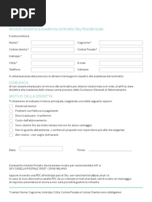 Modulo disdetta Sky PDF | Salvatore Aranzulla Per scaricare il modulo di disdetta Sky in formato PDF, recati su questa pagina del sito di Sky, individua la sezione Recesso entro 14 giorni (in fondo) e clicca sull'icona della freccia rivolta verso il basso, posta in corrispondenza del modulo di tuo interesse, in base al contratto che vuoi disdire (es.